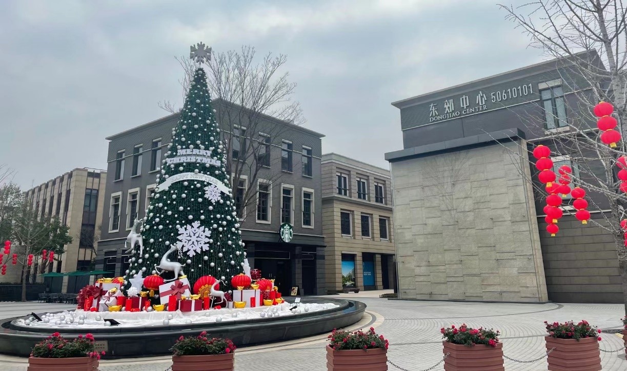 许下烟花满四城,新年旦降家家喜。春节即将到来,东郊中心也装扮上了新年装置,于2022年1月17日晚正式亮灯。