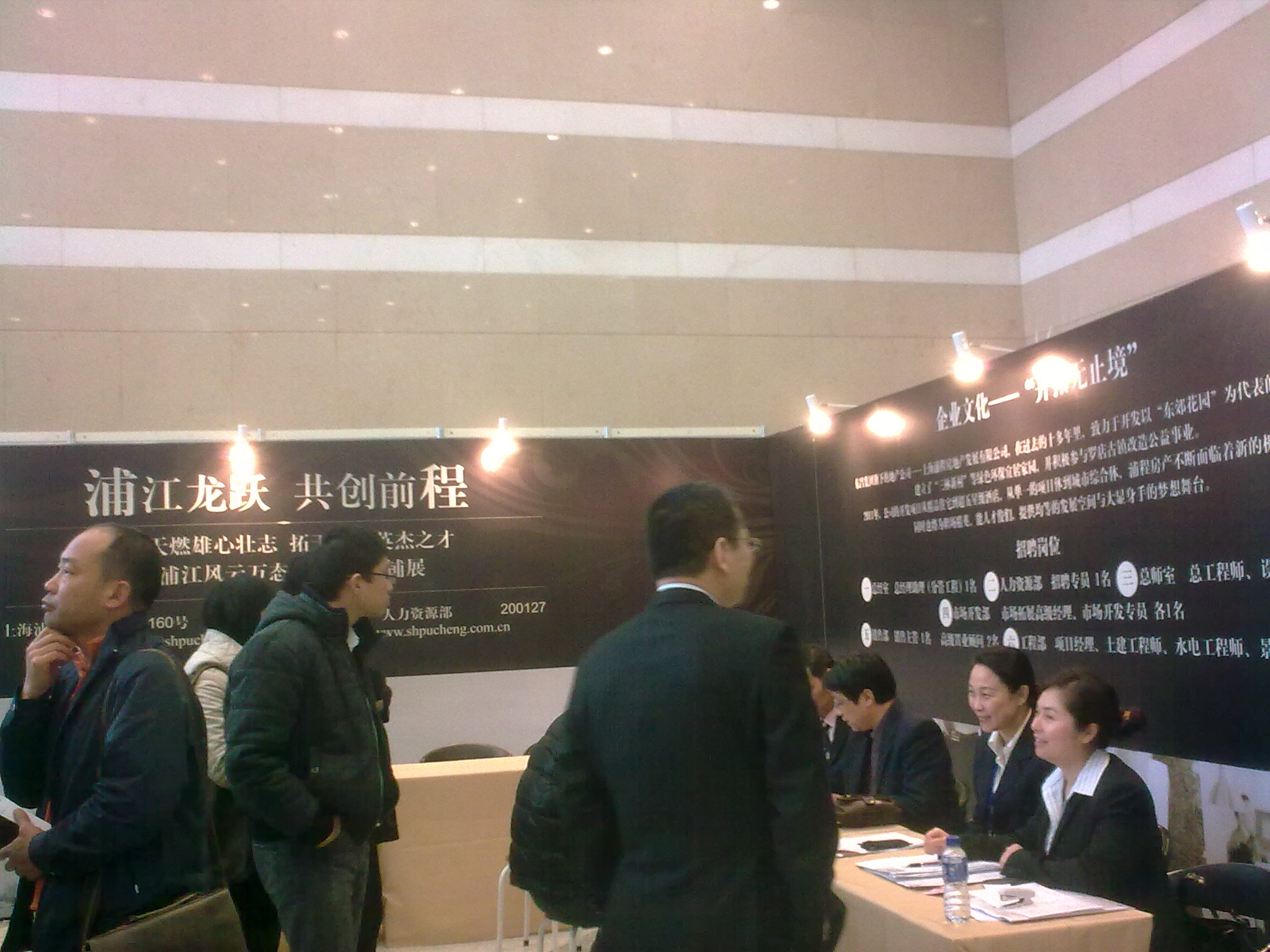 2011年3月19日,上海浦程房地产发展有限公司总经理丁建祖携同副总经理王诚、程晖及相关部门经理统一穿着深色西装、浅色衬衫,以饱满的精神状态参加了上海图书馆举办的房地产建筑人才专场招聘会。浦程房产端庄大气、暗金底纹的招聘海报凸显了公司高端的品质,在保利、世茂、绿城、大华等众多房产知名企业中鹤立独行,吸引了数名海归、博士、硕士、高级工程师前往应聘,全天共收集适合简历69份,初步筛选出20人参加面试。